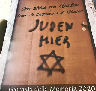 “Qui abita un Giudeo, Gesù di Betlemme di Giudea”. E a seguire le parole “Juden hier”, qui abita un ebreo appunto, e una stella di David come quelle usate dai nazisti per identificare gli ebrei.