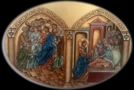 In quel tempo, essendo Gesù passato di nuovo in barca all’altra riva, gli si radunò attorno molta folla ed egli stava lungo il mare. E venne uno dei capi della sinagoga, di nome Giàiro, il quale, come lo vide, gli si gettò ai piedi e lo supplicò con insistenza: «La mia figlioletta sta morendo: vieni a imporle le mani, perché sia salvata e viva». Andò con lui. Molta folla lo seguiva e gli si stringeva intorno. Ora una donna, che aveva perdite di sangue da dodici anni e aveva molto sofferto per opera di molti medici, spendendo tutti i suoi averi senza alcun vantaggio, anzi piuttosto peggiorando, udito parlare di Gesù, venne tra la folla e da dietro toccò il suo mantello. Diceva infatti: «Se riuscirò anche solo a toccare le sue vesti, sarò salvata». E subito le si fermò il flusso di sangue e sentì nel suo corpo che era guarita dal male. E subito Gesù, essendosi reso conto della forza che era uscita da lui, si voltò alla folla dicendo: «Chi ha toccato le mie vesti?». I suoi discepoli gli dissero: «Tu vedi la folla che si stringe intorno a te e dici: “Chi mi ha toccato?”». Egli guardava attorno, per vedere colei che aveva fatto questo. E la donna, impaurita e tremante, sapendo ciò che le era accaduto, venne, gli si gettò davanti e gli disse tutta la verità. Ed egli le disse: «Figlia, la tua fede ti ha salvata. Va’ in pace e sii guarita dal tuo male». Stava ancora parlando, quando dalla casa del capo della sinagoga vennero a dire: «Tua figlia è morta. Perché disturbi ancora il Maestro?». Ma Gesù, udito quanto dicevano, disse al capo della sinagoga: «Non temere, soltanto abbi fede!». E non permise a nessuno di seguirlo, fuorché a Pietro, Giacomo e Giovanni, fratello di Giacomo. Giunsero alla casa del capo della sinagoga ed egli vide trambusto e gente che piangeva e urlava forte. Entrato, disse loro: «Perché vi agitate e piangete? La bambina non è morta, ma dorme». E lo deridevano. Ma egli, cacciati tutti fuori, prese con sé il padre e la madre della bambina e quelli che erano con lui ed entrò dove era la bambina. Prese la mano della bambina e le disse: «Talità kum», che significa: «Fanciulla, io ti dico: àlzati!». E subito la fanciulla si alzò e camminava; aveva infatti dodici anni. Essi furono presi da grande stupore. E raccomandò loro con insistenza che nessuno venisse a saperlo e disse di darle da mangiare.